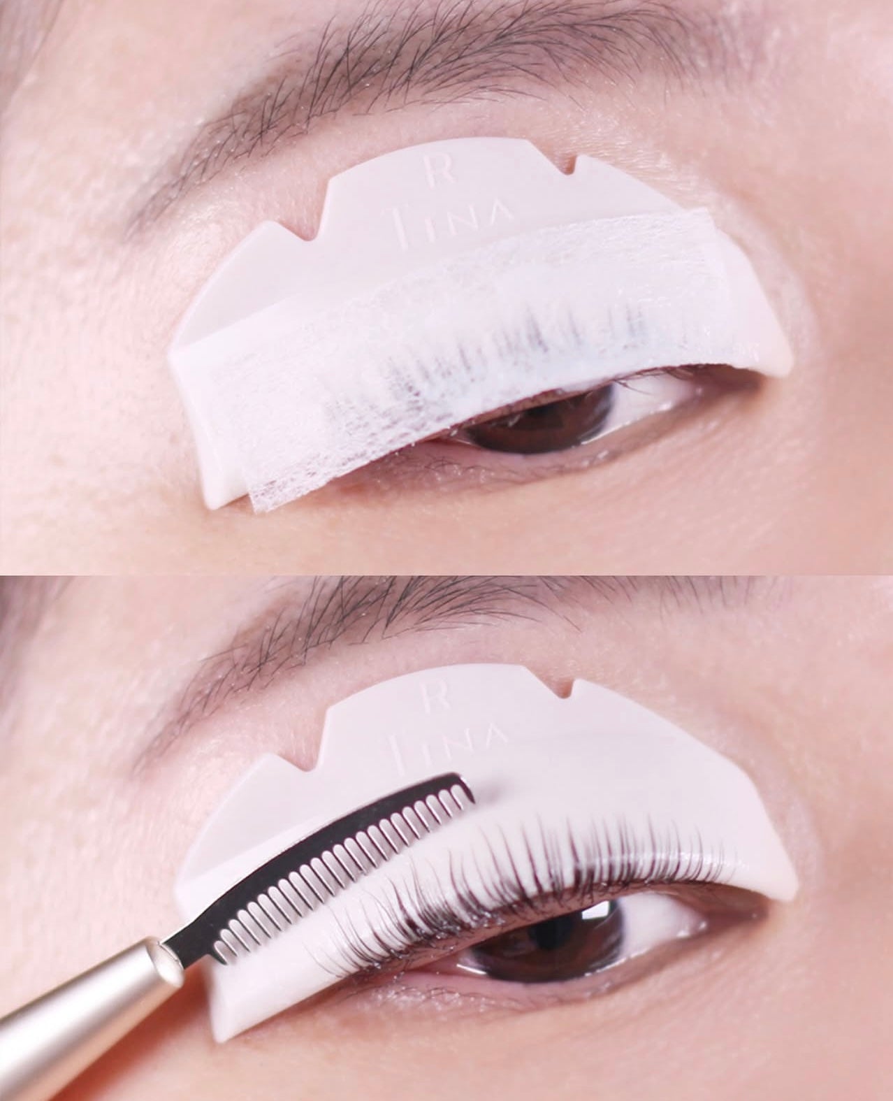 確認 R(右)和 L(左)方向後,將墊片貼近睫毛根部固定